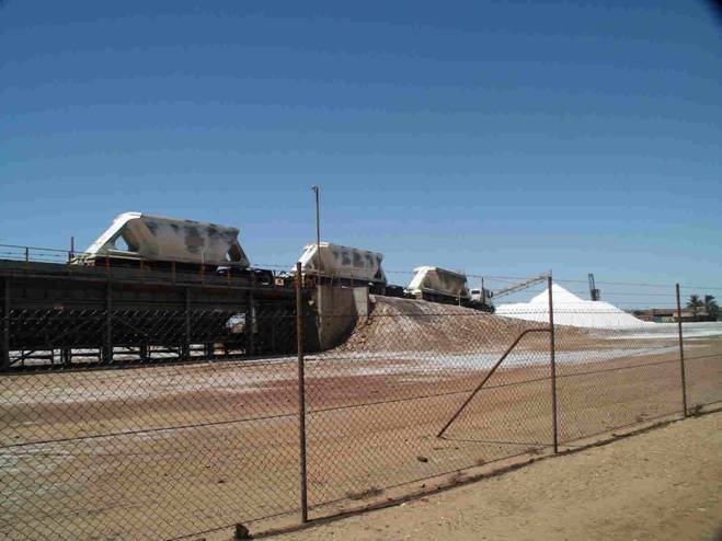In dem dortigen Motel mit Jugendherberge traf ich auf eine bunt gemischte Gruppe Reisender. Jeder für sich und trotzdem immer wieder zusammen, haben wir die letzten Etappen gemeinsam verbracht und z. B. in Exmouth mehrere Tauchgänge miteinander gemacht. Dies ist im Grunde nicht weiter verwunderlich, ist doch absolute Nebensaison und die points of interest die gleichen. Die Nebensaison genieße ich im Übrigen sehr – trotz Schulsommerferien gibt’s absolut keine Probleme beim Übernachten. Die Meersalzgewinnung liegt etwas außerhalb der Stadt und dem Hafengebiet. Es fahren deshalb rund um die Uhr sog. Roadtrains und laden das gewonnene Salz im Hafen ab. |