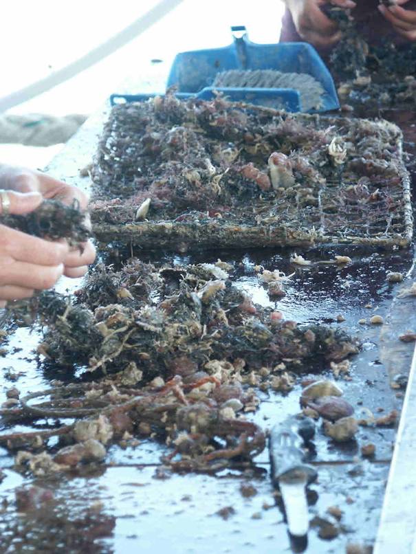 Nach dieser Arbeit wurden die Gitter wieder im Meer versenkt, zum weiteren Gedeihen und Wachstum. A propos WACHStum. Die Besitzer, 2 junge Männer und der Vater des einen, haben ein System zur einfacheren Reinigung der Muscheln entwickelt. Leider erst an Weihnachten, so dass diese Erleichterung für uns noch nicht gegriffen hat. Nach dem Reinigen der Muscheln tauchen sie diese nun kurz in flüssiges Wachs ein und können so bei der nächsten Reinigungsrunde einfach das Wachs mitsamt dem Bewuchs und Ablagerungen entfernen, das Wachs anschließend sogar wieder aufarbeiten. |
