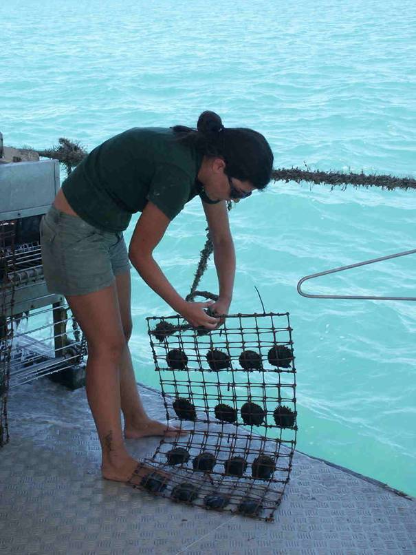 Dieser Tag mit dem frühen Start führte mich von Exmouth über Carnavron bis nach Denham. Carnavron ist die Obstkammer Australiens – hier gedeiht auf grund des hervorragenden Klimas sowie des ausreichend vorhandenen Süßwassers faktisch alles. Darüber hinaus ist die Stadt für Ihre tollen Surfstrände bekannt. Ein kurzer Versorgungsstopp für Diesel und Lebensmittel und es ging weiter nach Denham. Denham dann ist die ´Stadt´, 20 km vor Monkey Mia, wo die Delfine bis an den Strand kommen sollen. Als ich abends ankam traf ich wieder auf Adele und Michael (die Zwei aus der Tauchergruppe). Beiden meinten es gäbe hier nicht viel zu tun und zu sehen, aber ich müsste unbedingt mit auf die morgige 1,-A$ Perlenfarmtour mitkommen. Ich sagte spontan zu, denn was konnte ich schon verlieren – außer einem Dollar? So wurden wir am nächsten Morgen kurz nach 8.00Uhr abgeholt und von Monkey Mia aus mit dem Boot raus auf die Perlfarm gebracht, gespannt was uns dort erwarten würde. Vorausschicken möchte ich, dass der sog. ´Sonntagsanzug´ nicht unbedingt die richtige Bekleidung gewesen wäre – mal ganz unabhängig von der Temperatur. Die 1Dollar Tour basiert darauf, dass Frau und Mann einen Tag auf der Perlfarm mitarbeiten. Der eine Dollar muss aus versicherungstechnischen Gründen wohl berechnet werden – wird aber nie kassiert. Die Arbeit ist, da neu für alle Besucher, interessant und ich werde in den nächsten Wochen, Monate … sicherlich keine 2. Chance dazu bekommen. Diese Perlenfarm ist noch jung und im Aufbau. Bis zu den ersten Erträgen vergehen erst einmal zwischen 10 und 15 Jahren. Zuerst werden die jungen Muscheln in großen Tanks ´gezeugt und geboren´ und dort auch für ca. 3 Monate aufgezogen. Nach dieser Zeit futtern sie soviel, dass dies nicht mehr in diesen Tanks ausreichend gewährleistet werden kann. Nun kommt der Sprung ins kalte Wasser – die Muscheln werden in flachen Netzen mit eingelegten Perlonfäden ausgesetzt. Dort klammern sich an die Fäden und futtern kräftig … bis wieder ca. 4 Monate vorbei sind. Dann müssen sie das erstemal raus aus der Badewanne um von Verschmutzungen, Pflanzen und anderen Unterwasserlebewesen gereinigt werden. Dies war unsere erste Tätigkeit an diesem Morgen. Es eine etwas schmuddelige Arbeit, da die Fäden voll bewuchert waren und ein Teil der komischen Dödels beim Entfernen plötzlich nach einem gespritzt haben. Aber wir waren ja alle nicht zum Vergnügen da… |