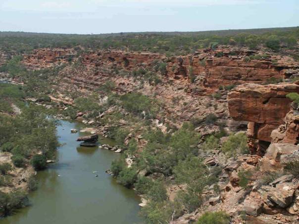 Damit das Wachstum auch anhält werden immer wieder ca. 1mm größere Perlen eingesetzt – was den Ummantelungsvorgang regelmäßig von vorne startet. So stellt eine Muschel in Ihrem Leben bis zu 4 unterschiedlich große Perlen her und alle Frauen dieser Welt freuen sich über diese Juwelen des Meeres. Ach ja, unsere Mittagspause haben wir mit einem Schnorchelausflug in der Bucht verbracht. Das macht diesen Arbeitsplatz durchaus interessant. Nach dem Aufräumen und Reinigen der Arbeitsflächen ging es zurück nach Denham; gerade rechtzeitig damit die 3 Männer pünktlich zur Happy Hour im örtlichen Pub ankommen. Darauf würden sie achten, meinte der Vater … Der nächste Tag diente der Entspannung: Nach einem gemütlichen Vormittag mit hervorragendem Frühstück inkl. Ei, einer kleinen Wanderung, dem Golfturnier auf dem örtlichen (Busch-Mini-)Golfplatz und einem leckeren Abendessen mit Julia und Roger ging es freitags morgens um 6.00 Uhr wieder auf den Highway. Die Strecke führte mich heute leider durch etwas eintönige Gegenden mit wenig Bewuchs; Ziel war Kalbarri bzw. der Kalbarri National Park mit seinem Murchinson River. Dieser Fluss hat im Lauf von Millionen Jahren sich ein teilweise 150m tiefes und noch breiteres Flussbett gegraben. Auf der Anfahrt gab es schon 2 Aussichtspunkte die viel versprachen für die Wanderung am kommenden Sonntag. Aber erst mal ging es noch am gleichen Tag auf eine Wanderung durch Millionen Jahre alte Steine - den sog. Mushroom Rocks sowie durchs Rainbow Valley. Abends dann, Ihr ahnt es schon, war ich mit Adele und Michael (sie waren einen Tag vor mir angereist) zum Nachtessen. Da ich schon gegessen hatte konnte ich mich ganz der Dessertkarte und den dazugehörigen Gerichten widmen. Den Heimweg rollend anzutreten – mit dem guten Vorsatz die Pfunde wieder abzuwandern – wäre kein Problem gewesen. Leider musste ich an diesem Abend noch erfahren, dass meine Mama wieder im Krankenhaus liegt und eine OP an Ihrer letzen Niere über sich ergehen lassen musste. Meine Nacht war, nach der Horrorstory die mir geschildert wurde, nicht sehr gut. Auf diesem Wege nochmals alles Liebe und schnelle Genesung! (P.S.: In der Zwischenzeit ist Mama wieder daheim und auf dem Wege der Besserung J)