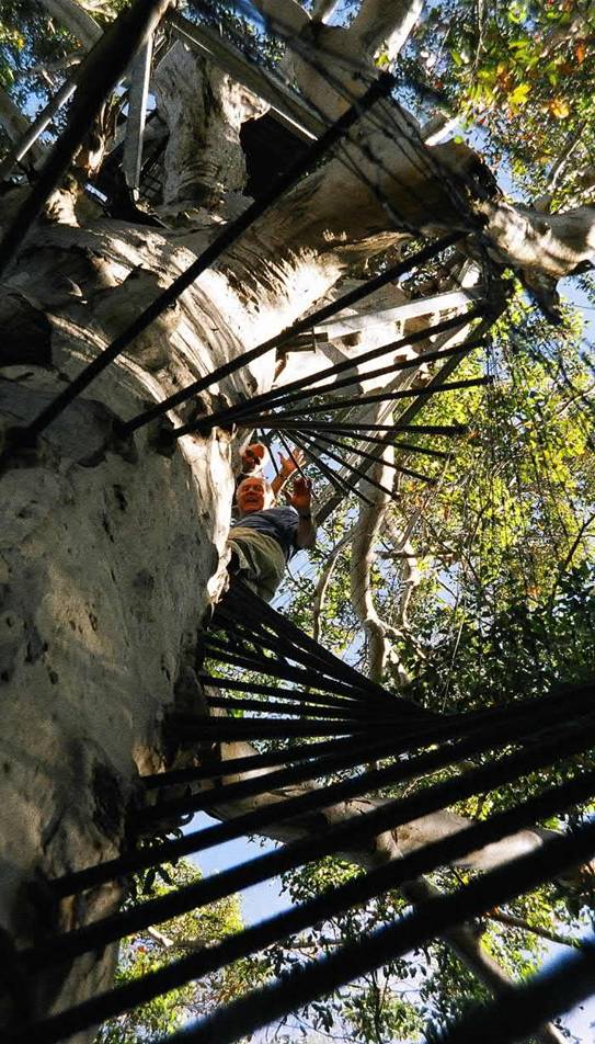 Stellt Euch einfach einen 63 Meterhohen Baum vor, der wendelförmig bis in die Spitze mit ca. 60 cm langen Eisenstäben gespickt ist. Tja hier gings dann hoch. Aber auf den gleichen Eisenstäben begegnet einem auch der abwärtige Gegenverkehr. Ein heisses Gefühl, wenn sich der Stab beim Passieren eines Absteigenden plötzlich nach unten biegt. Gesichert ist der Aufstieg nur durch eine Art Drahtgeflecht oben drüber. Nach unten? Nichts! Tapfer sind wir alle 3, mit unseren
